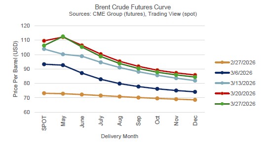 Brent crude prices have risen sharply, moving from the low-$70s in late February to roughly $100+ by month-end. The entire futures curve has shifted higher alongside spot but remains clearly downward sloping (“backwardated”), with prices declining into the low-$80s by year-end. Also note that aside from the first week of the war (ending 3/6), the longer-term expectations have remained consistent since the outset.